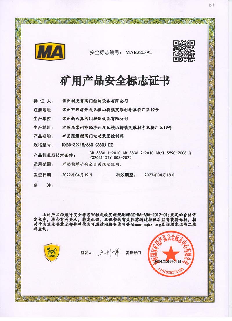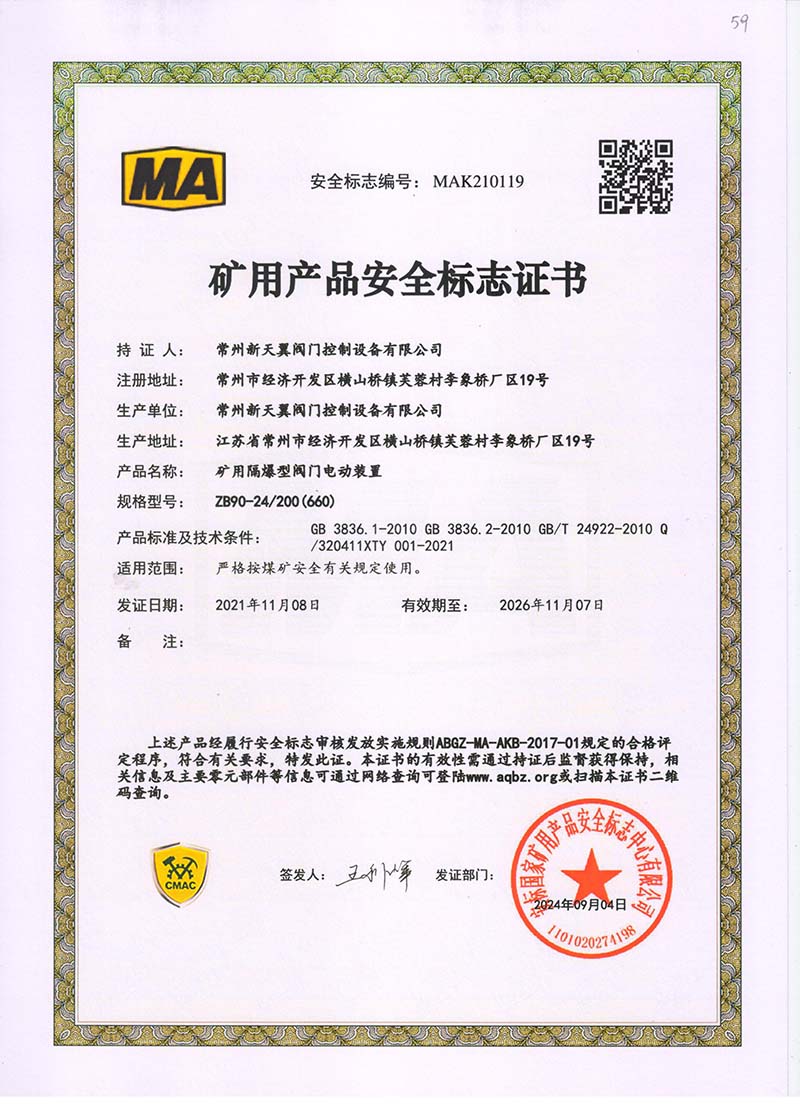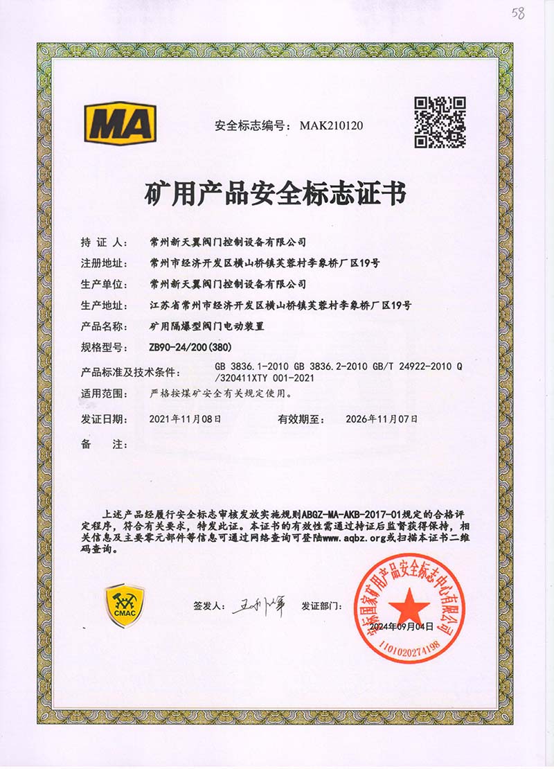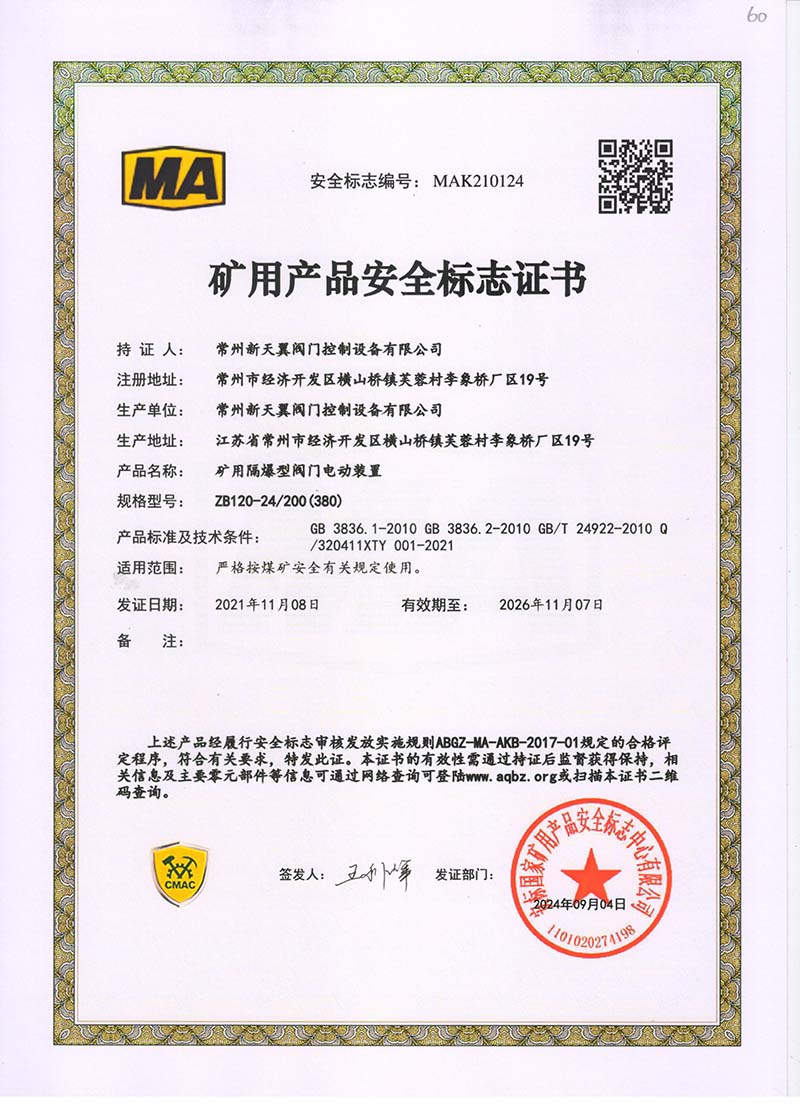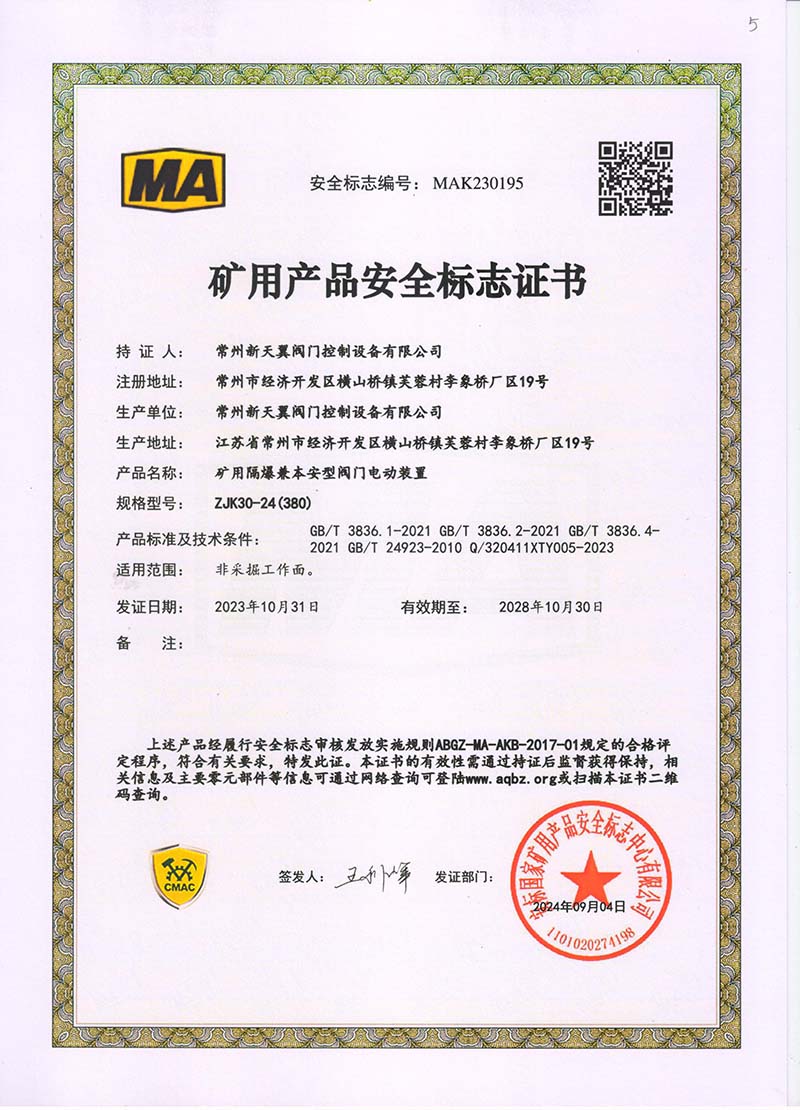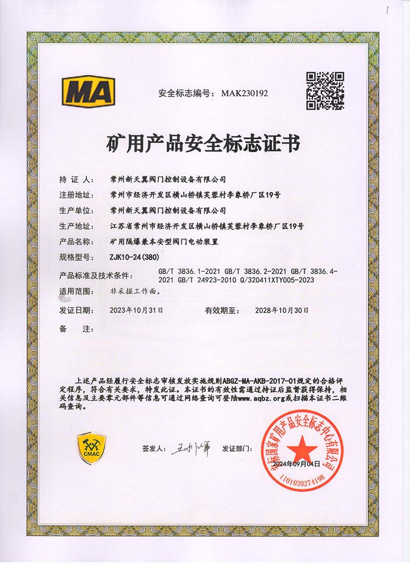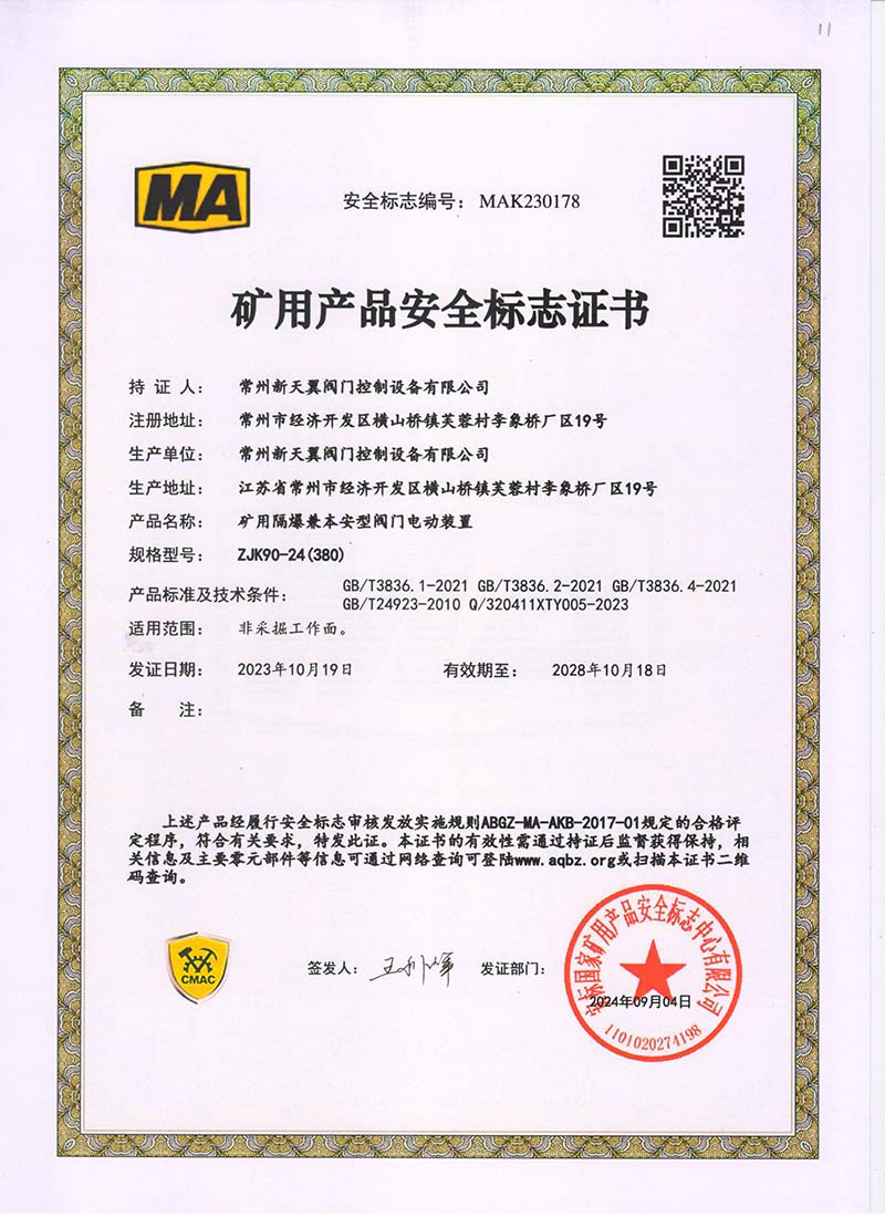 礦用產(chǎn)品安全標(biāo)志證書ZJK60-24(380)