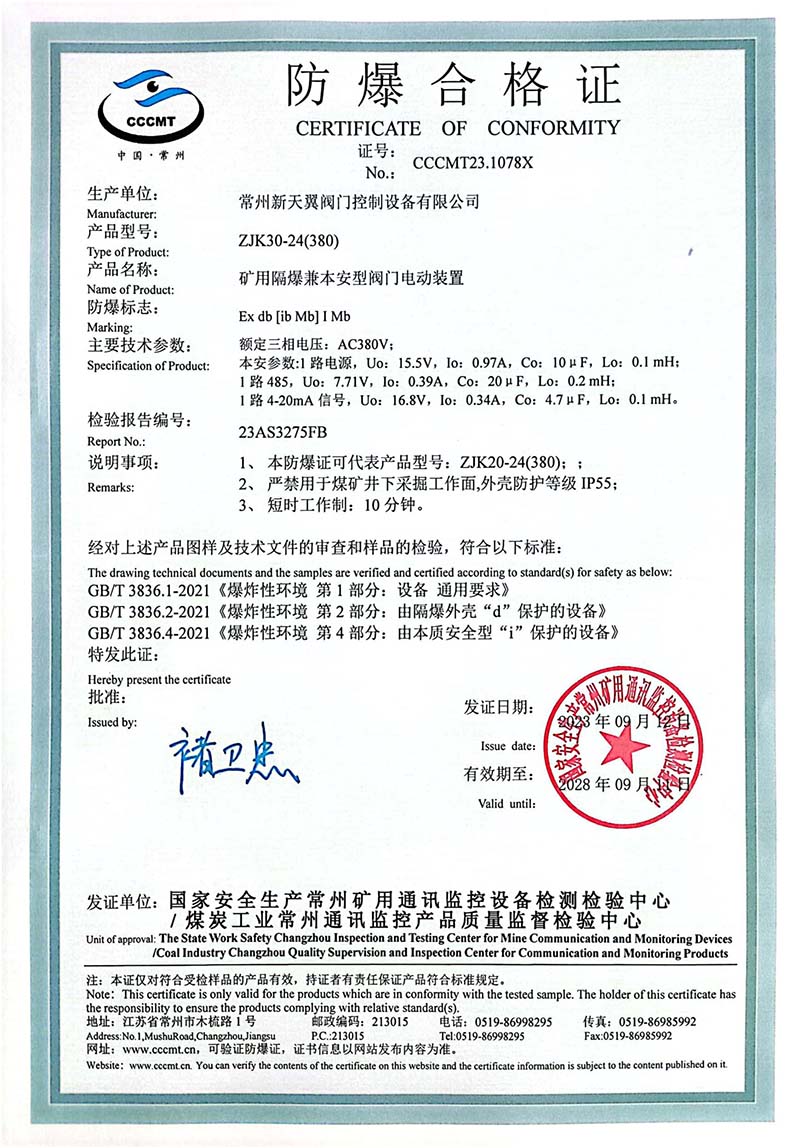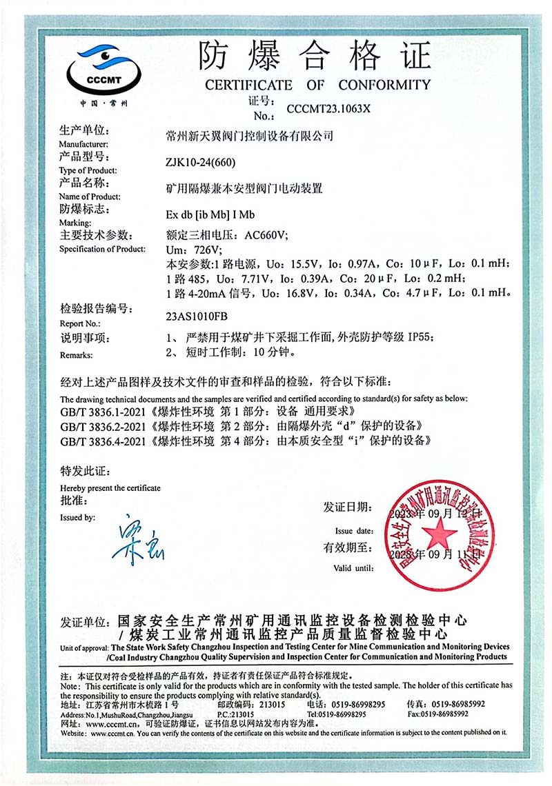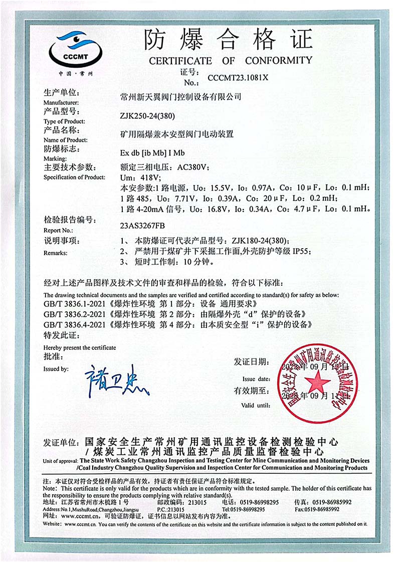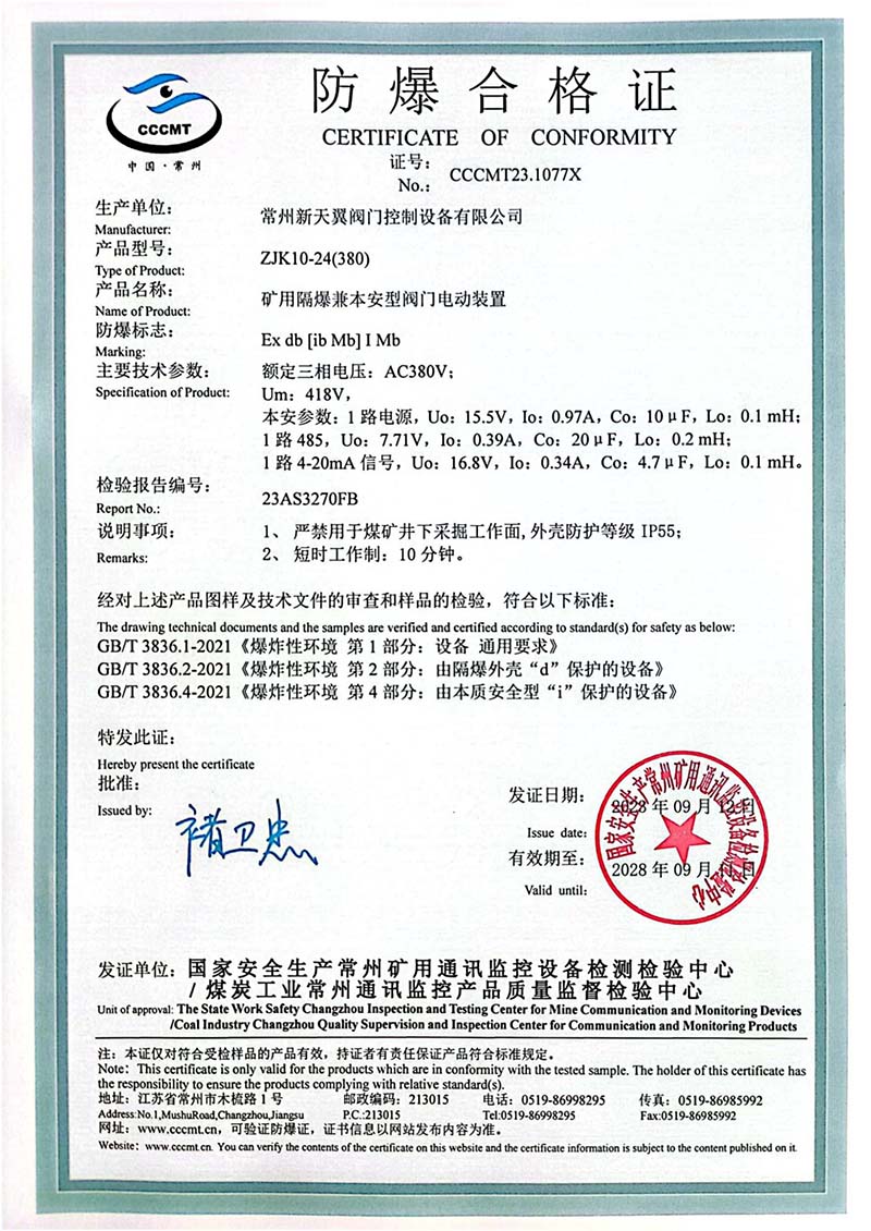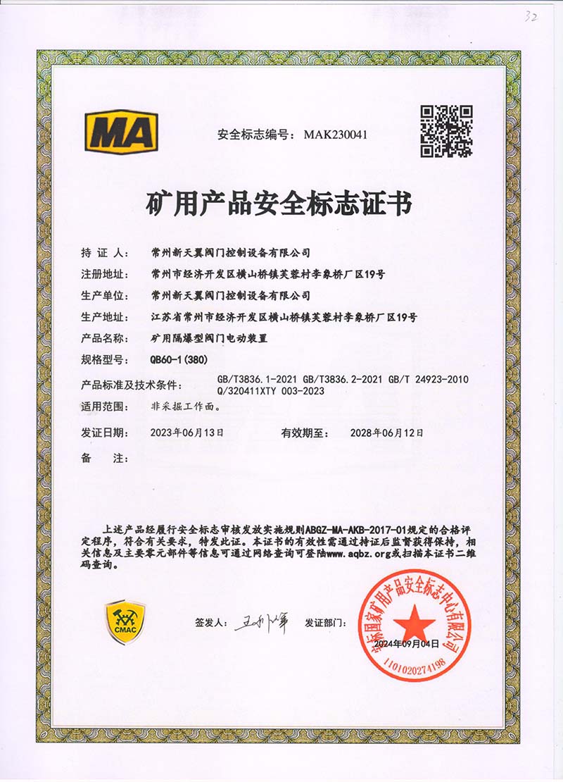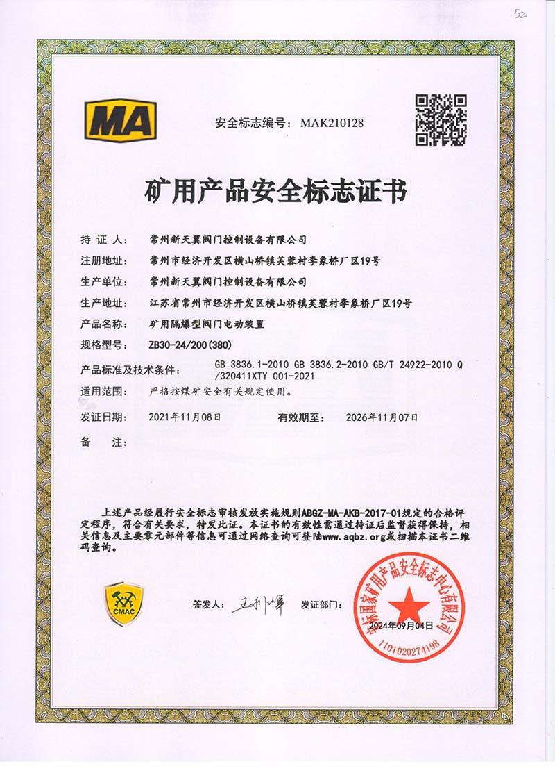 礦用產(chǎn)品安全標(biāo)志證書ZJK60-24(380)