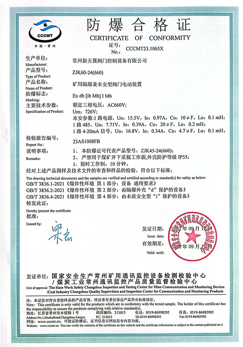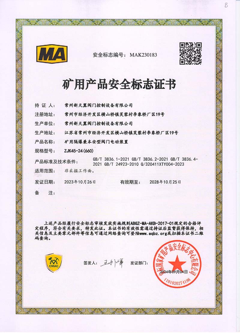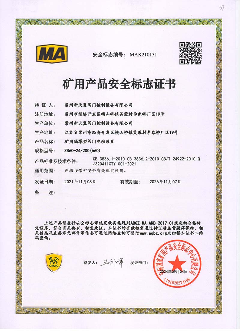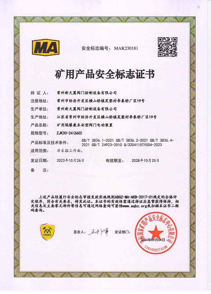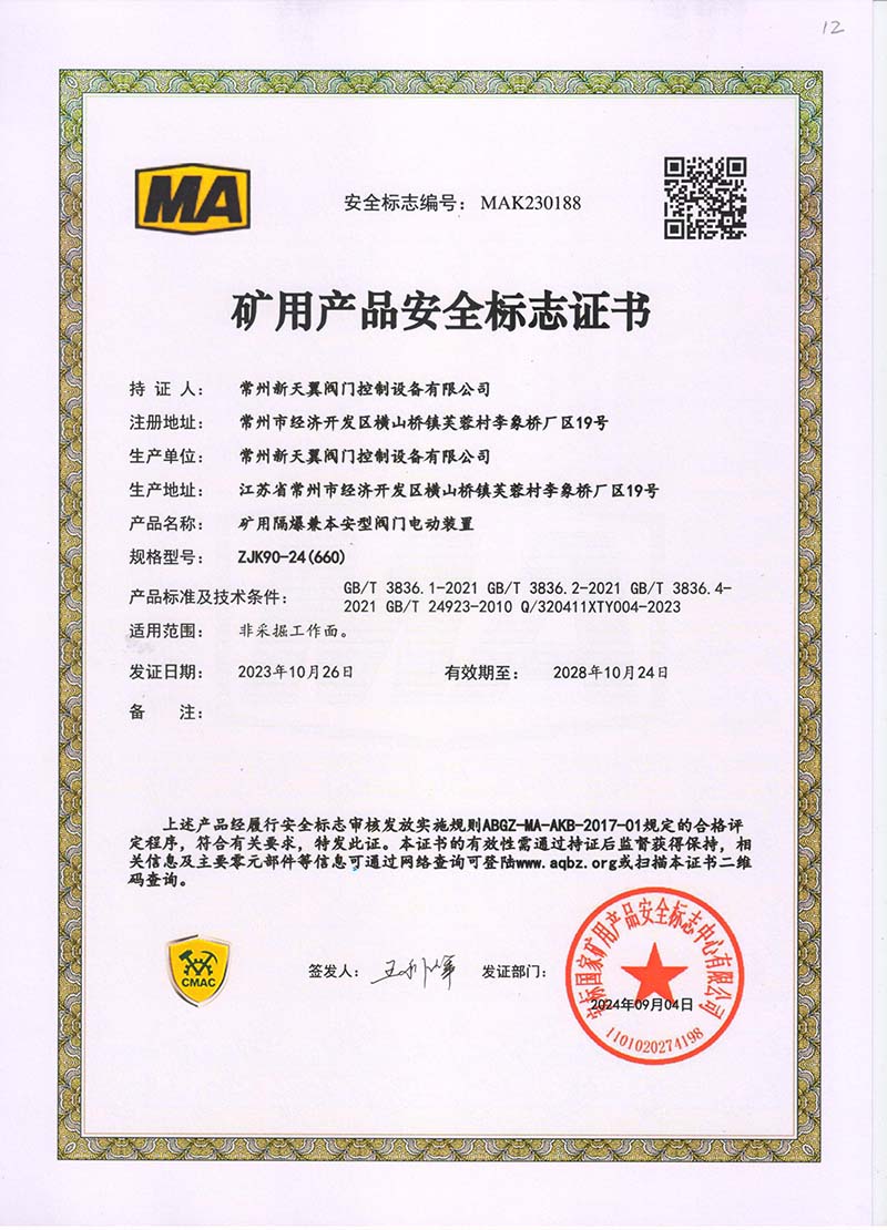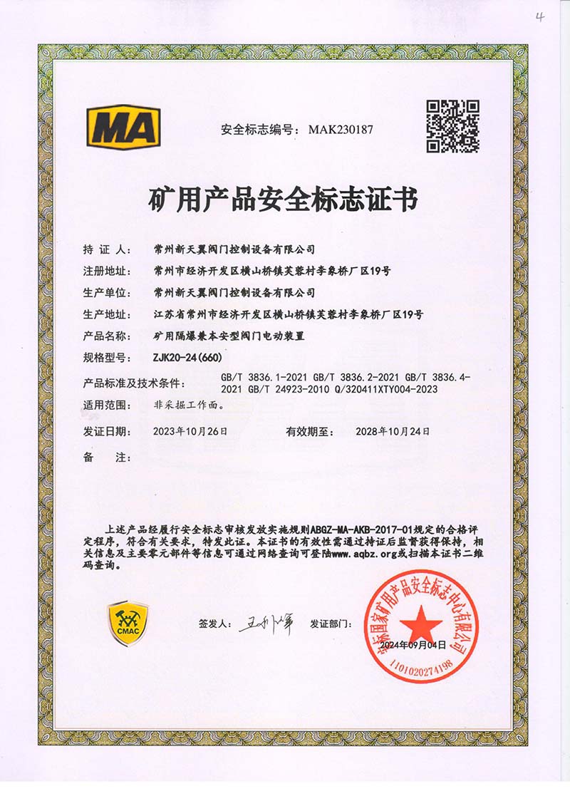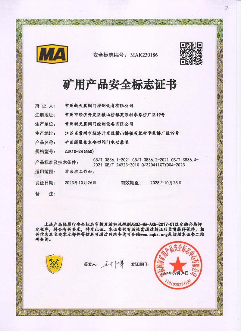 礦用產(chǎn)品安全標(biāo)志證書ZJK60-24(660)