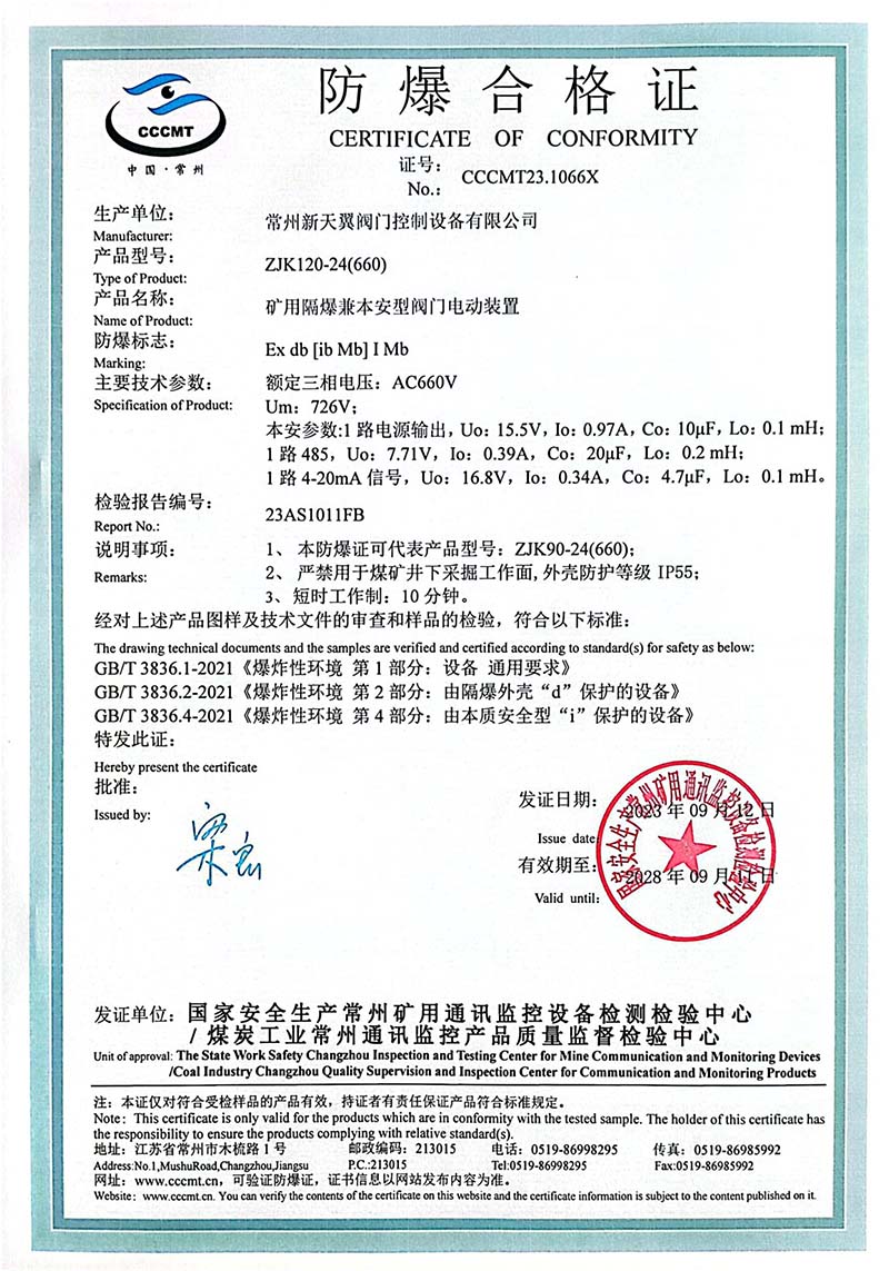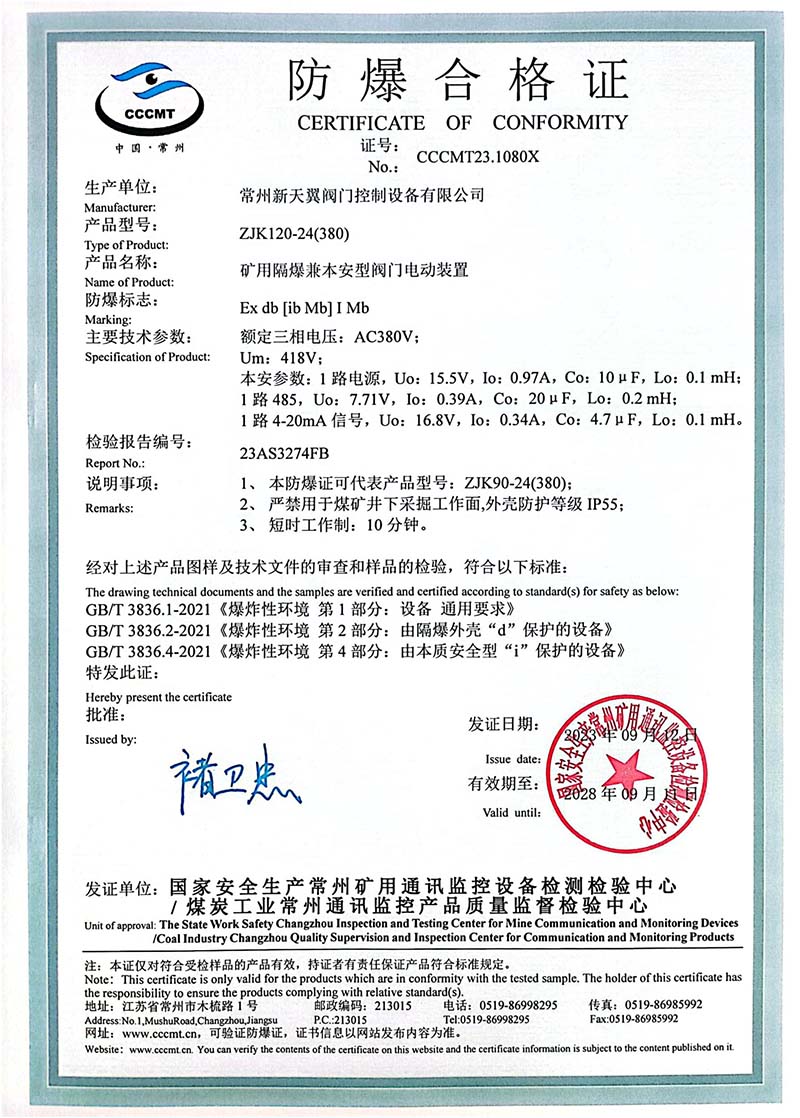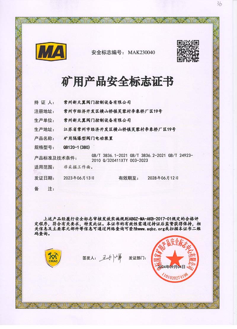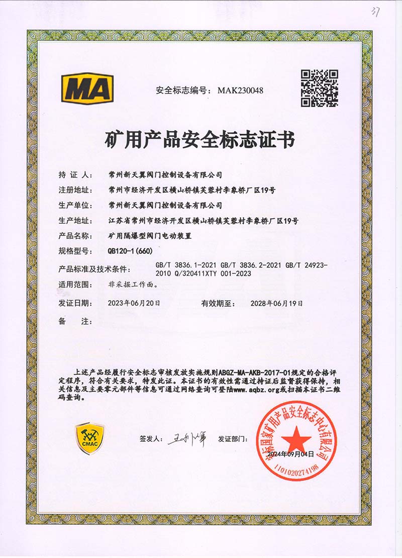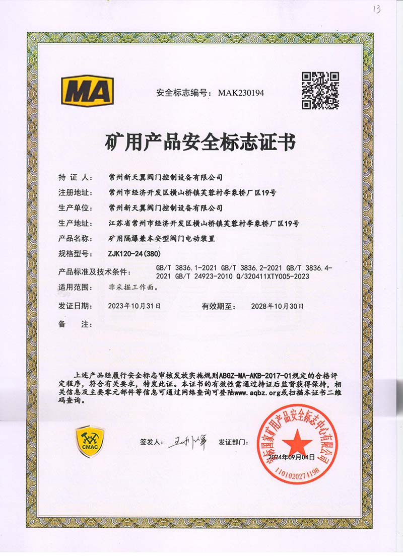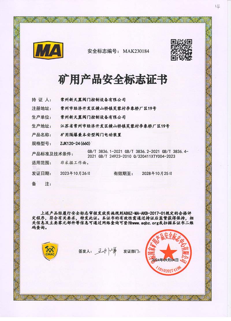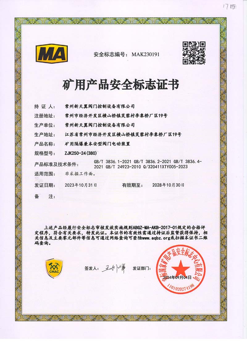 礦用產(chǎn)品安全標(biāo)志證書ZJK120-24(380)