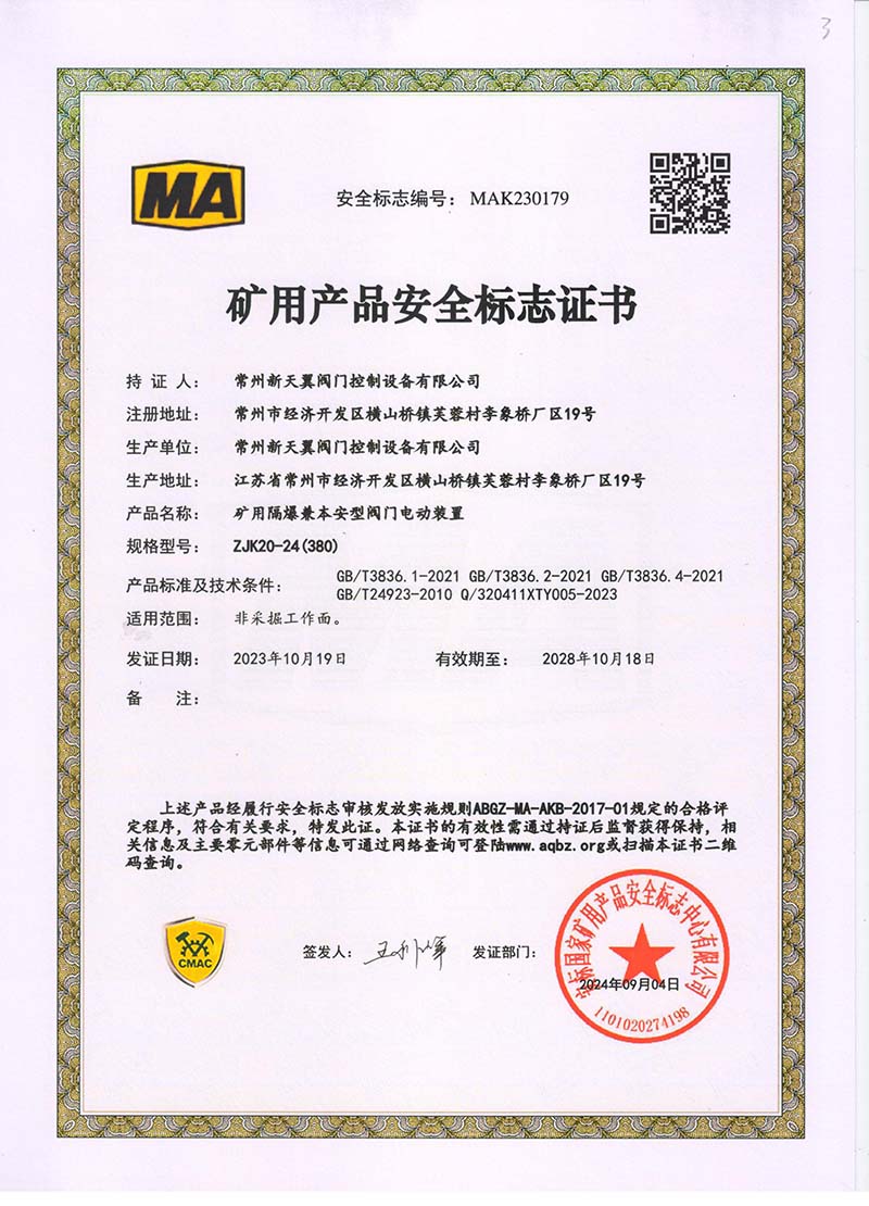 礦用產(chǎn)品安全標(biāo)志證書ZJK180-24(380)