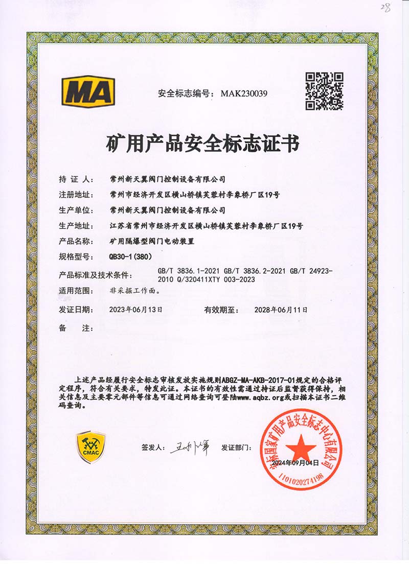 礦用產(chǎn)品安全標(biāo)志證書ZJK30-24(380)