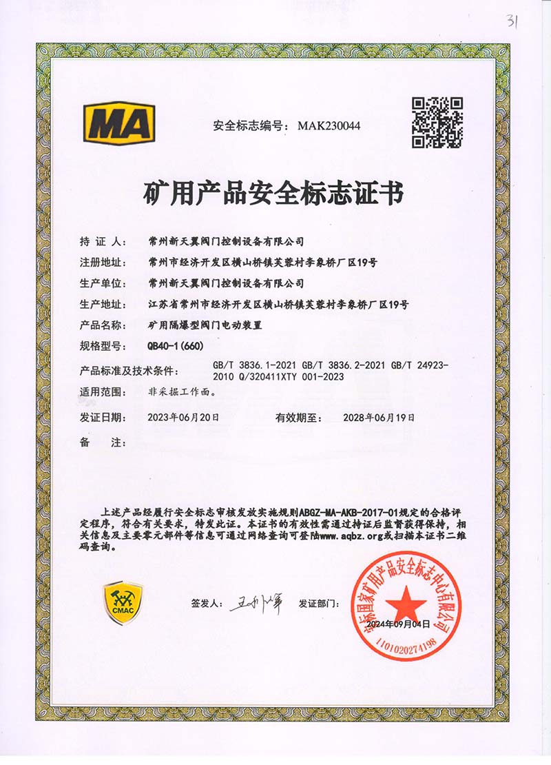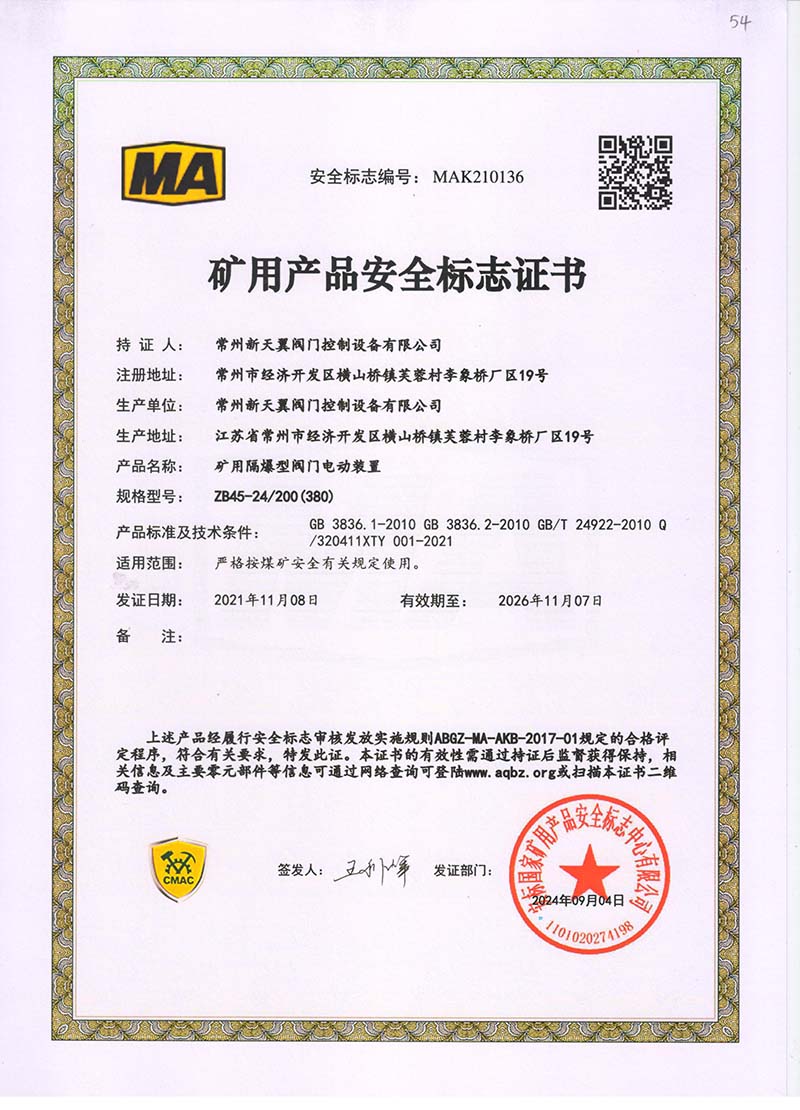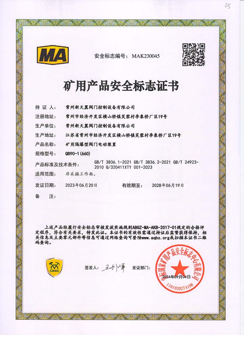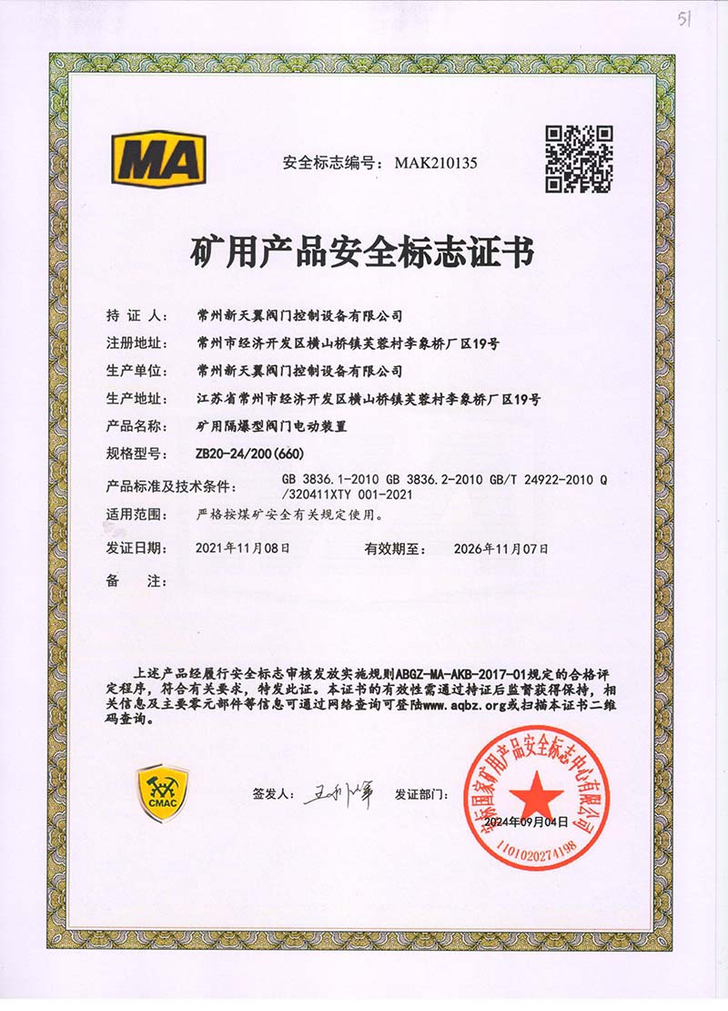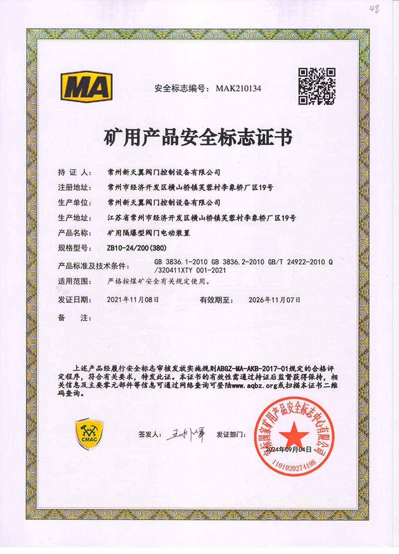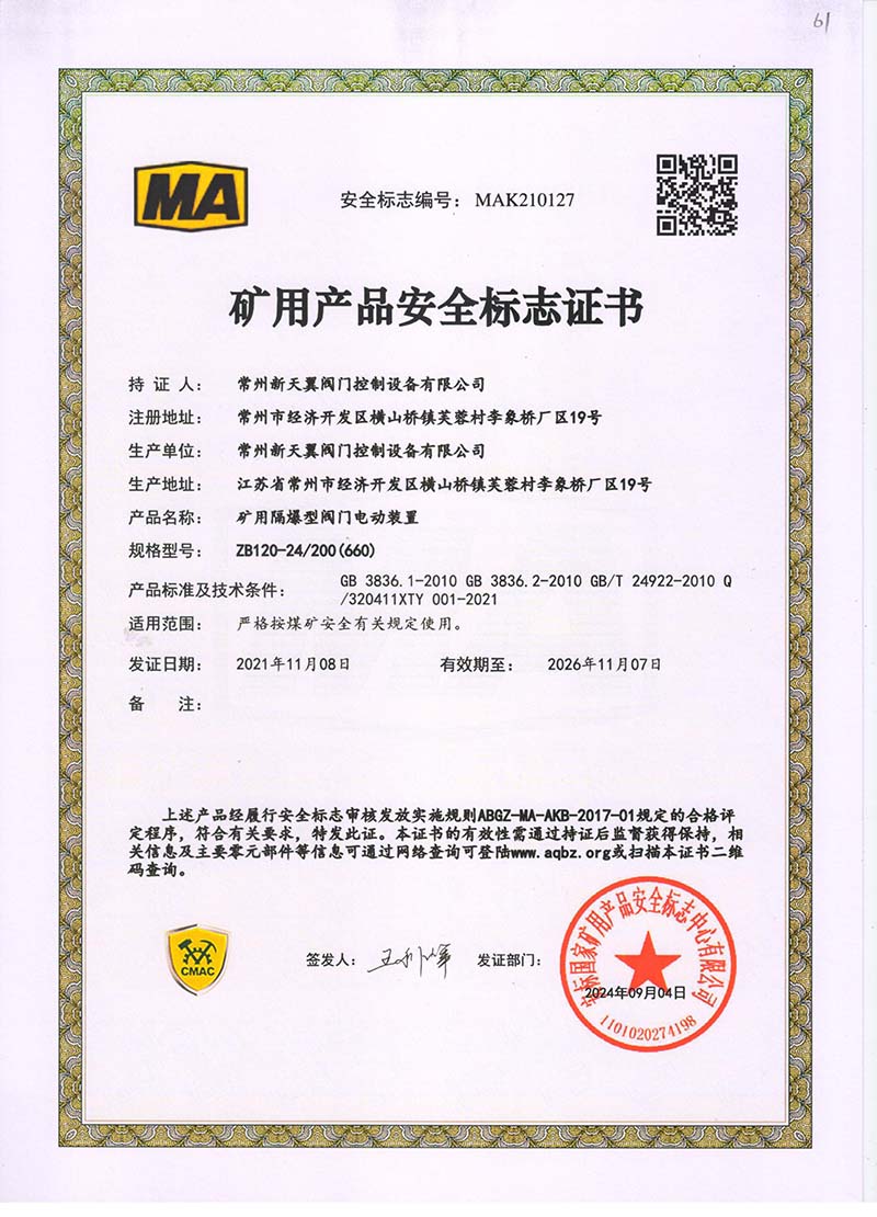 礦用產(chǎn)品安全標(biāo)志證書ZB30-24 200(660)