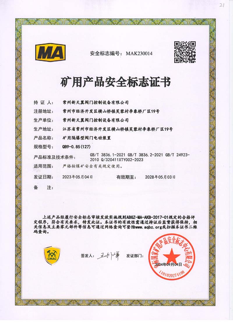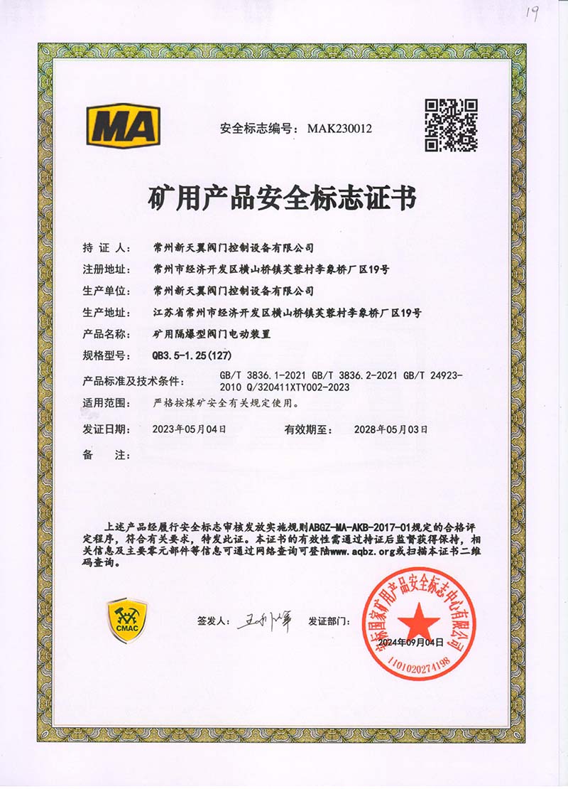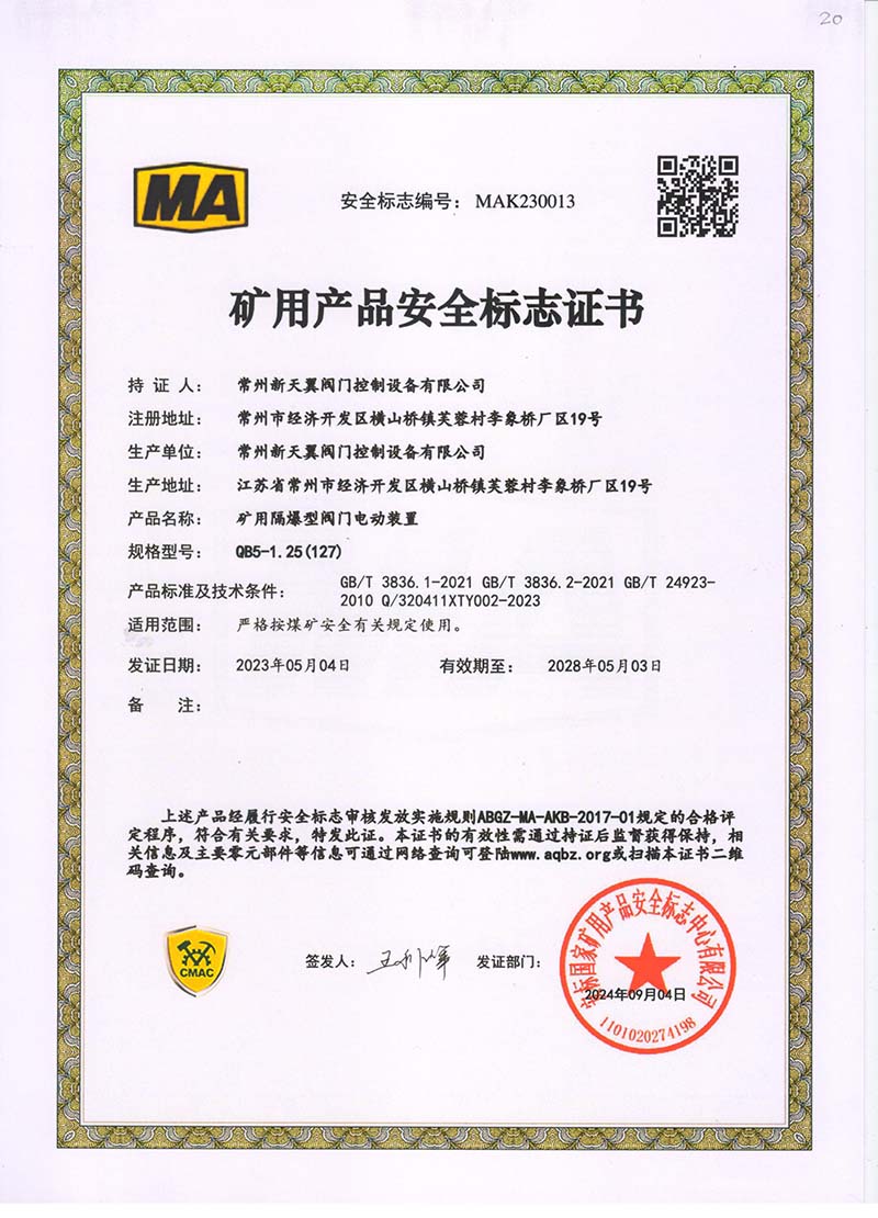 礦用產(chǎn)品安全標(biāo)志證書QB5-1.25(127)