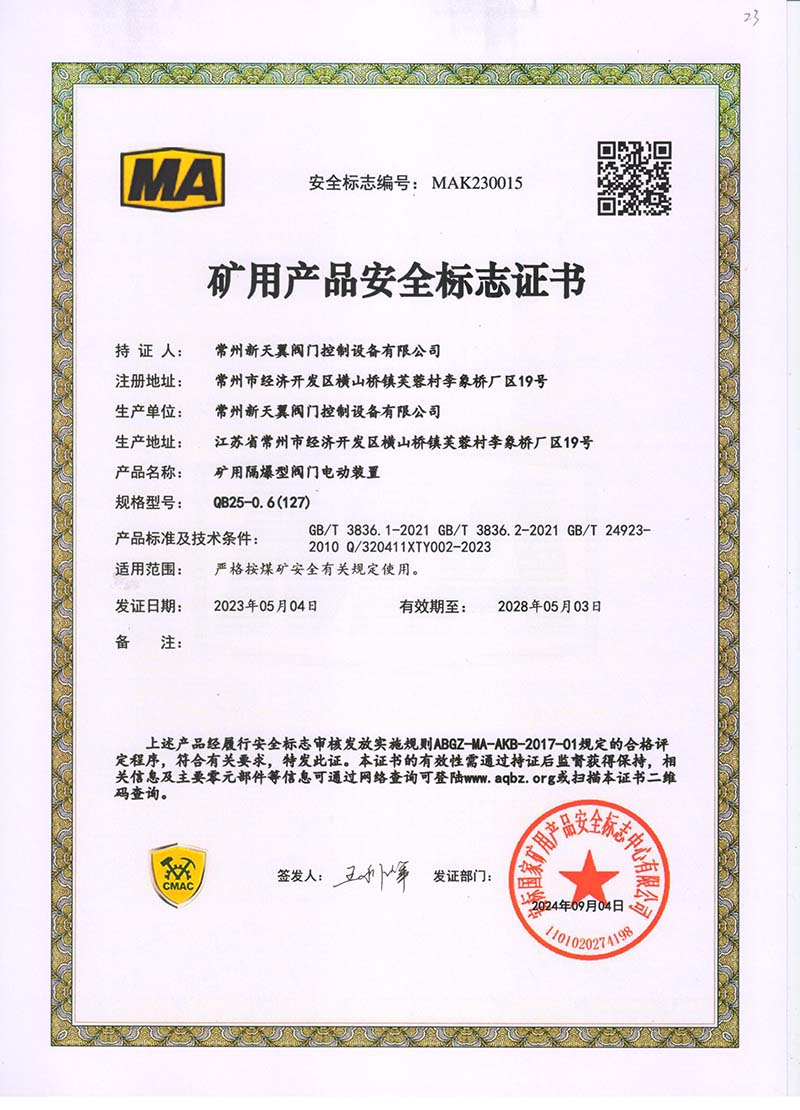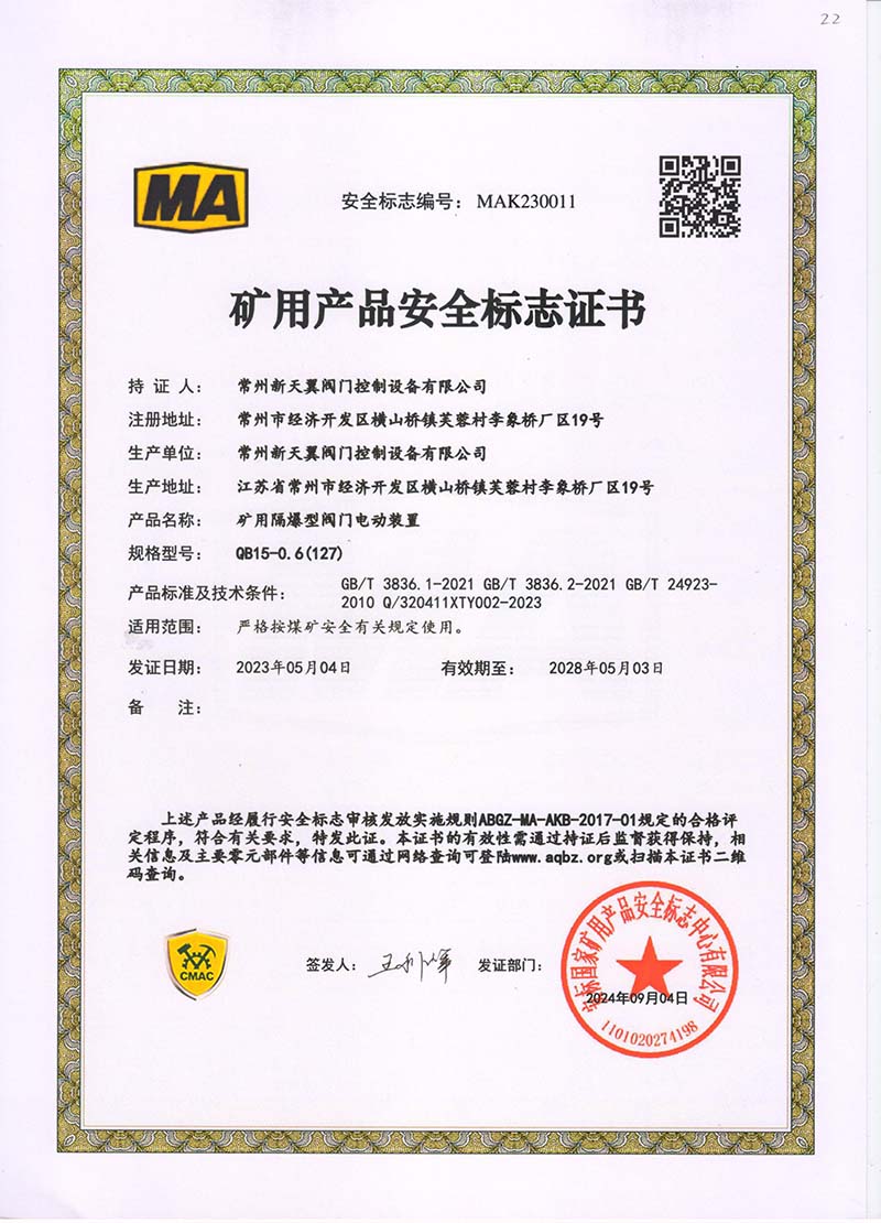 礦用產(chǎn)品安全標(biāo)志證書QB25-0.6(127)