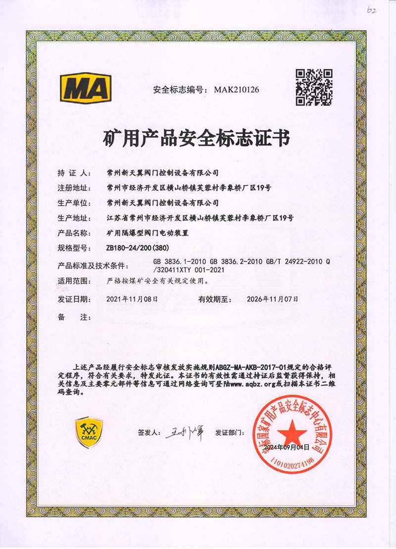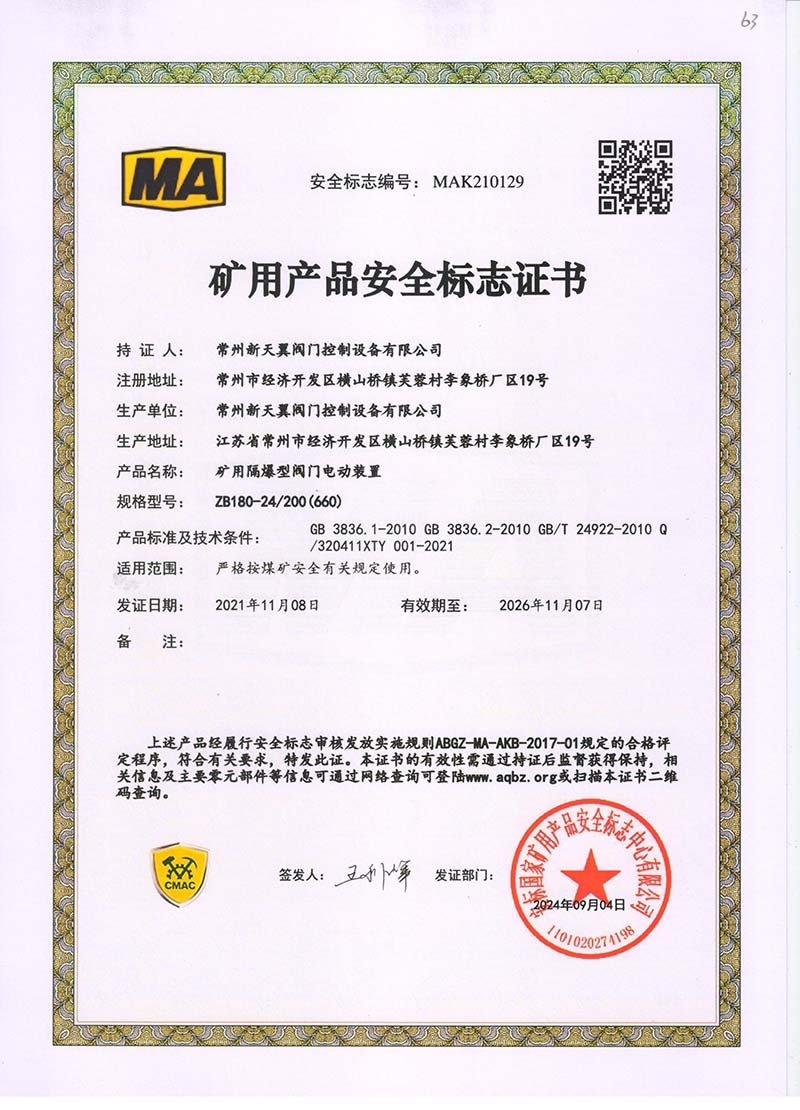 礦用產(chǎn)品安全標(biāo)志證書ZB180-24 200(660)