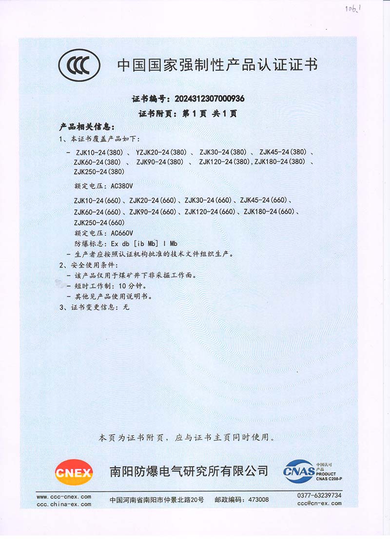 礦用產(chǎn)品安全標(biāo)志證書ZB10-24 200(380)