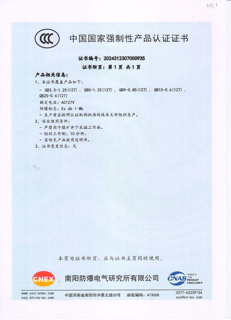 礦用隔爆QB127V 中國國家強制性產(chǎn)品認(rèn)證證書105.1