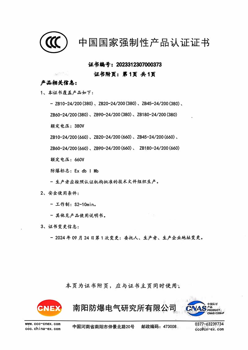 礦用產(chǎn)品安全標(biāo)志證書ZB90-24 200(380)