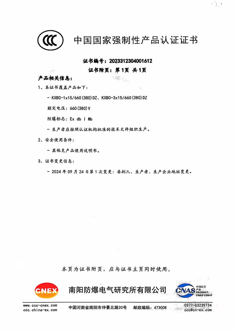 礦用產(chǎn)品安全標(biāo)志證書KXBC-1 15 660(380)DZ